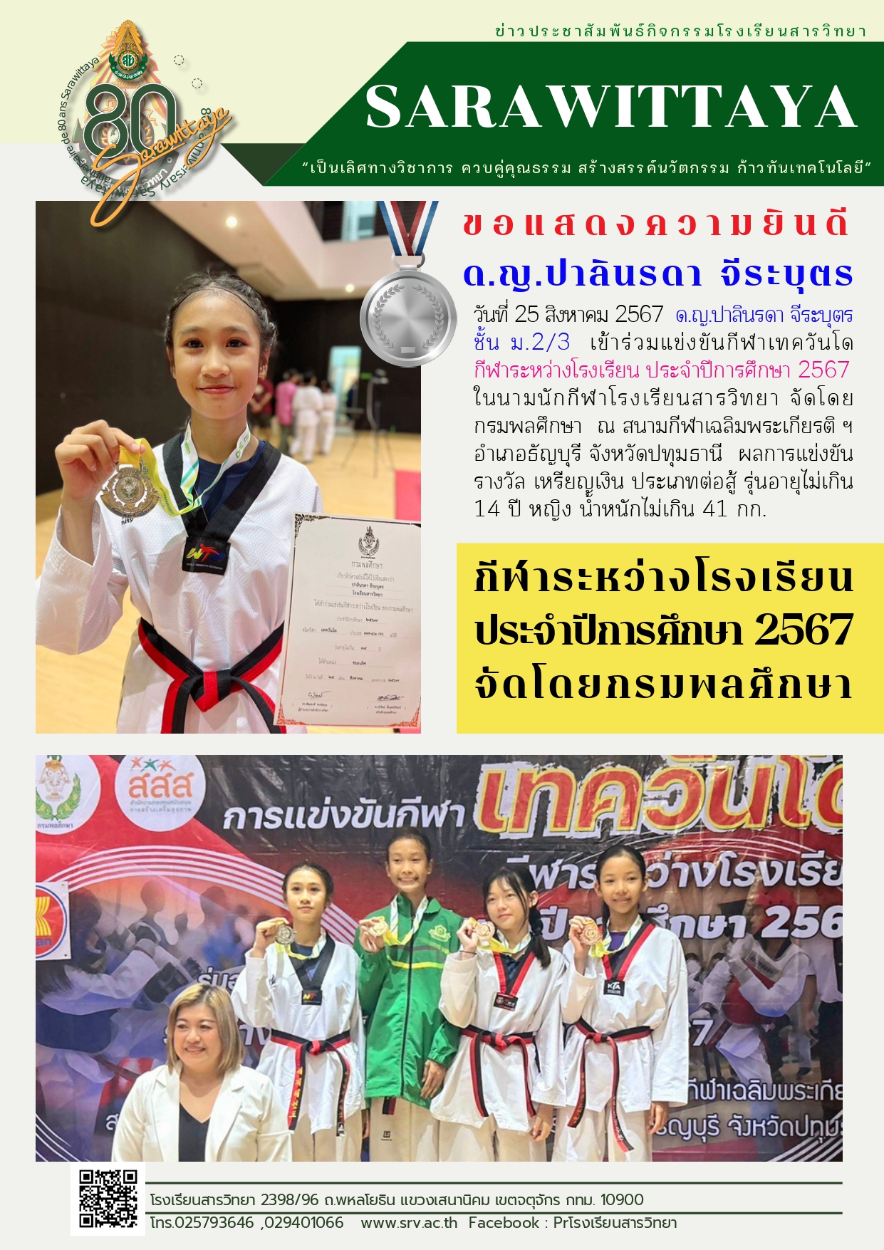 รางวัลเหรียญเงิน การแข่งขันกีฬาเทควันโด ระหว่างโรงเรียน ประจำปีการศึกษา 2567
