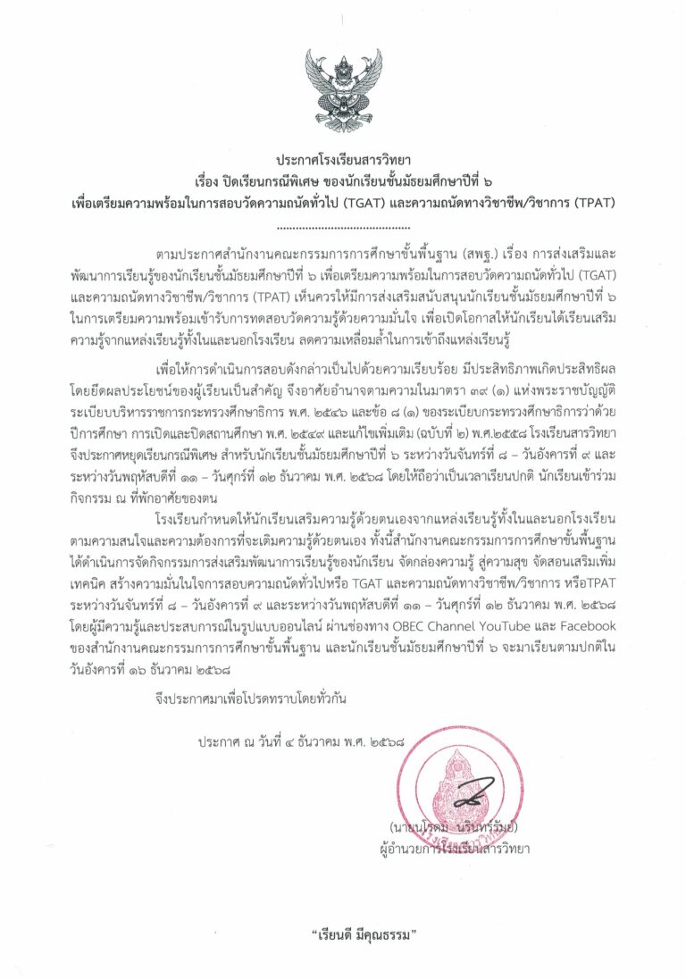 ปิดเรียนกรณีพิเศษ ของนักเรียนชั้นมัธยมศึกษาปีที่ 6 เพื่อเตรียมความพร้อมในการสอบTGAT และTPAT