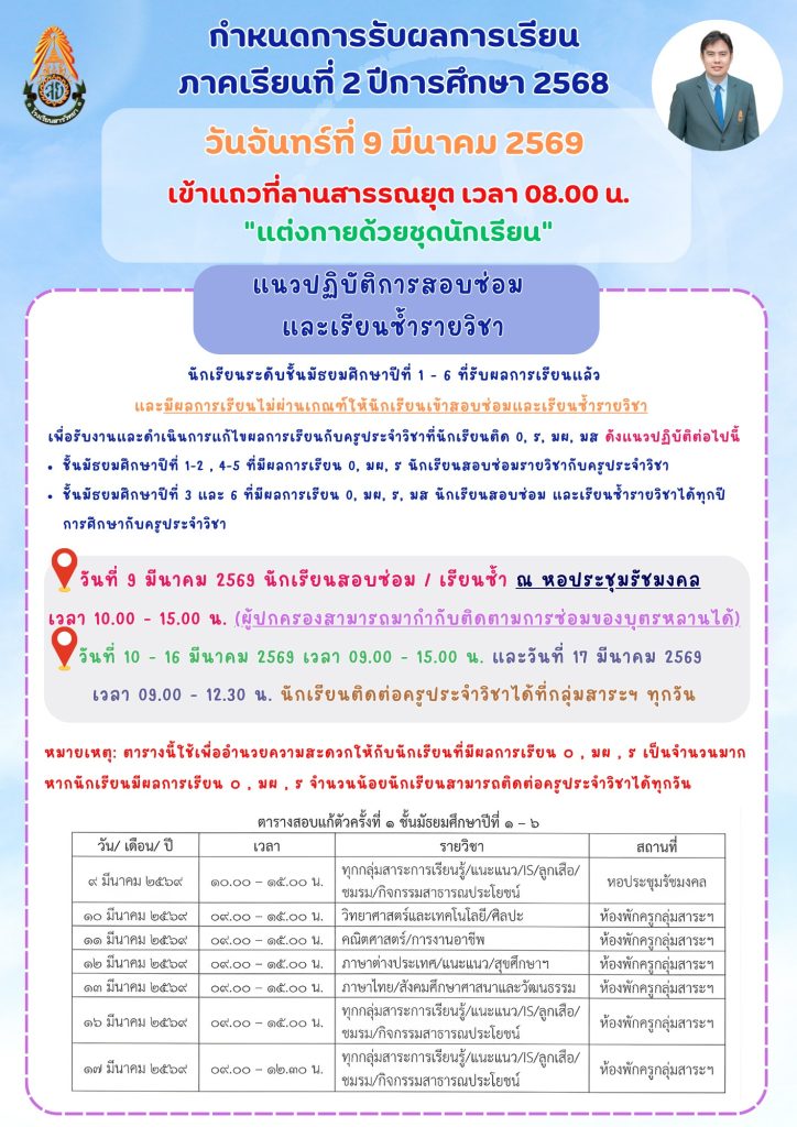 กำหนดการรับผลการเรียนภาคเรียนที่ 2 ปีการศึกษา 2568