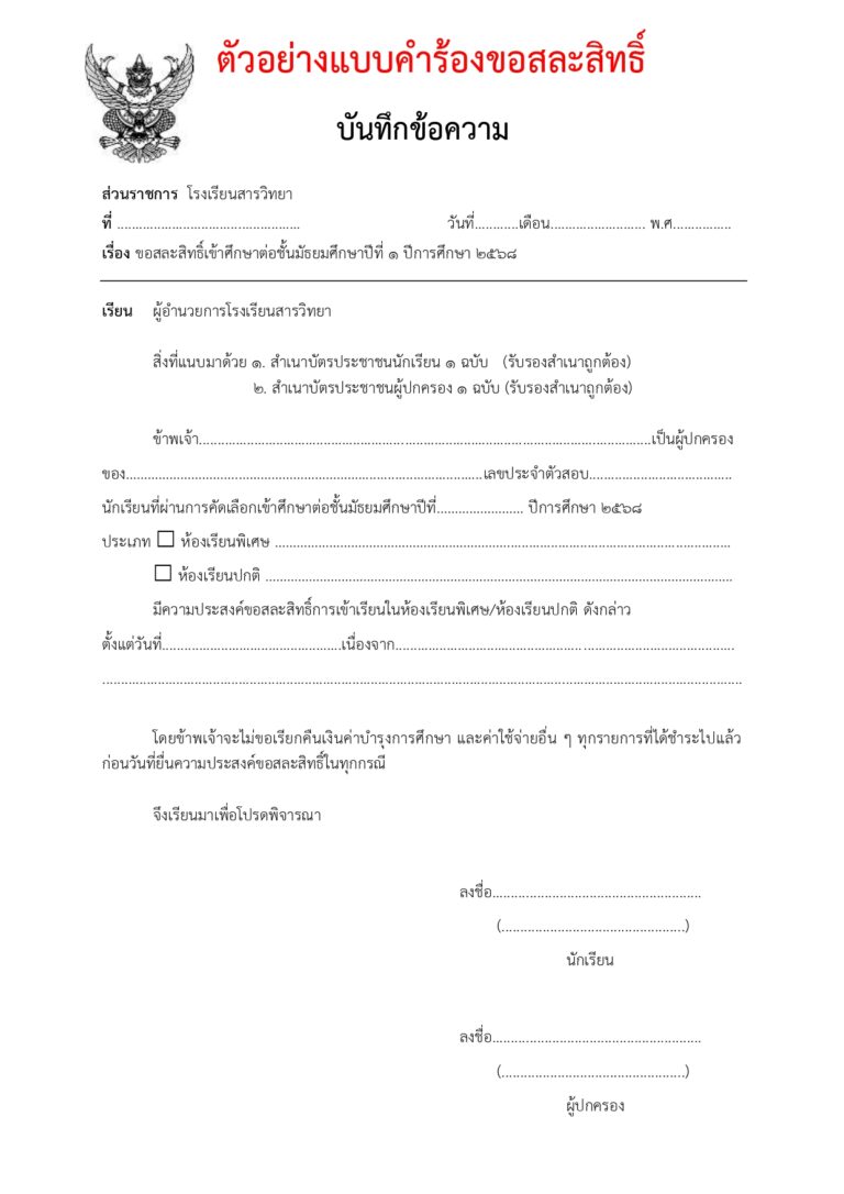 สละสิทธิ์เข้าเรียน ขั้นตอนการสละสิทธิ์ กดสละสิทธิ์ พร้อมอัพโหลดเอกสารดังนี้ 1. แบบคำร้องขอสละสิทธิ์ - แบบคำร้องสำหรับ ม.1 คลิกที่นี่ - แบบคำร้องสำหรับ ม.4 คลิกที่นี่ 2. สำเนาบัตรประชาชนนักเรียน 3. สำเนาบัตรประชาชนผู้ปกครอง สละสิทธิ์ห้องเรียนพิเศษ ม.1 และ ม.4 สละสิทธิ์ห้องเรียนปกติ ตัวอย่างแบบคำร้องขอสละสิทธิ์ ตัวอย่างหลักฐานบัตรประชาชน